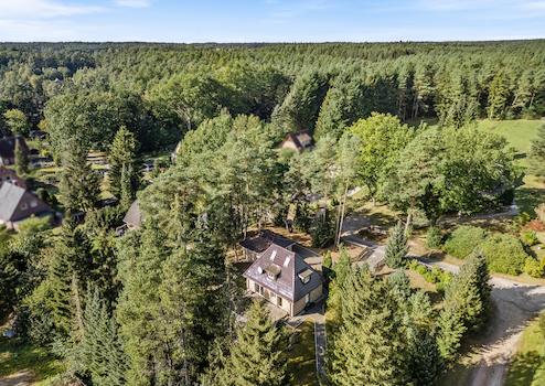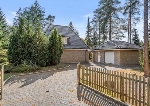 Das Grundstück ist pflegeleicht angelegt, vollständig eingezäunt und von altem Baumbestand umgeben. Der Garten fügt sich harmonisch in die natürliche Umgebung ein und bietet eine eigene kleine Heidelandschaft. Die Dachterrasse ist nach Süden ausgerichtet und bietet die Möglichkeit, eine Terrassenüberdachung, einen Wintergarten oder eine Erweiterung des Wohnraums zu realisieren. Die zweite Terrasse im Souterrainbereich ist gepflastert und ebenfalls südlich ausgerichtet. Im Jahr 2019 wurde das Außenareal durch eine Garage mit elektrischem Tor und einem angrenzenden Abstellraum ergänzt.