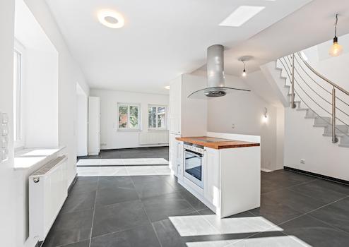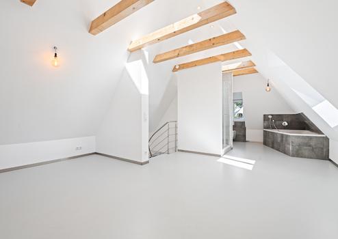 Das Dachgeschoss überzeugt durch einen offenen Schlafbereich mit integriertem Vollbad. Hohe Decken, sichtbare Deckenbalken und große Dachfenster schaffen hier eine helle und einladende Wohnatmosphäre. Der hochwertige, helle Kunstharzboden unterstreicht den modernen Charakter dieses Bereichs.