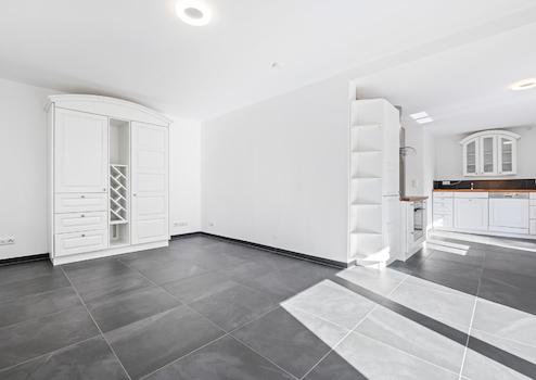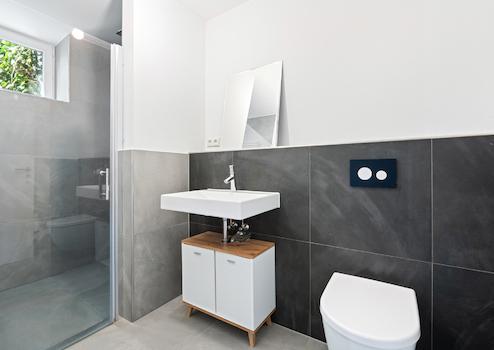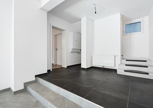Im Souterrain befindet sich ein großzügiger Wohnbereich mit bodentiefen Fenstern, Fußbodenheizung und direktem Zugang zur zweiten Terrasse. Ein weiterer Raum mit separatem Außenzugang, ein Duschbad mit Fenster, ein Heizungsraum sowie ein Hausanschlussraum mit Waschmaschinenanschluss komplettieren das Untergeschoss. Auch hier wurden moderne, dunkel- und hellgraue Fliesen verlegt, die ein harmonisches Gesamtbild erzeugen.