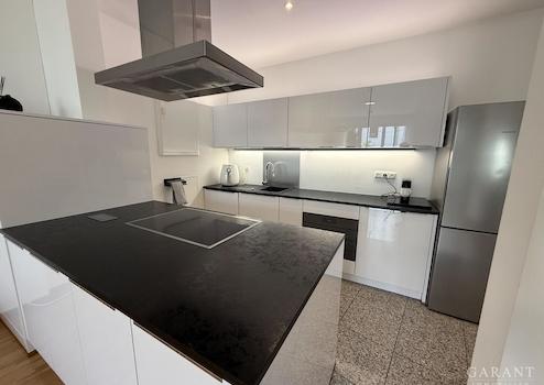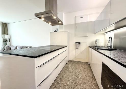 Das Herzstück ist das großzügige Wohnzimmer mit seiner beeindruckenden Fensterfront und direktem Zugang zur sonnigen Terrasse. Hier lässt es sich entspannen, Freunde empfangen oder einfach die Abendstunden genießen. Die angrenzende Küche ist ein Traum für alle, die gerne kochen: Natursteinboden, hochwertige Markengeräte und eine moderne Kochinsel laden ein, kulinarische Erlebnisse zu teilen und gemeinsame Momente zu genießen.