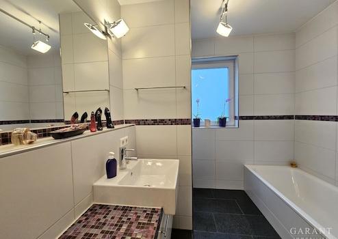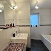 * Tageslichtbad mit hellen Fliesen, Badewanne, bodengleicher