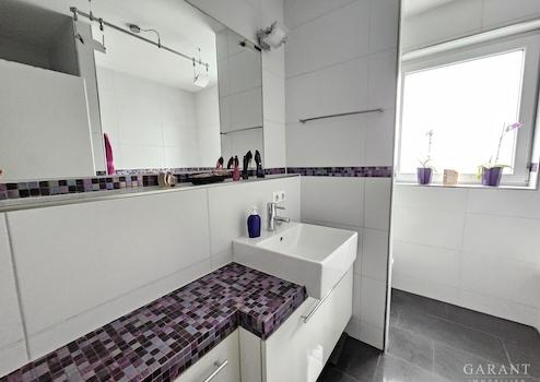- Tageslichtbad mit bodengleicher Dusche, Badewanne und Einbaumöbeln (praktischer Stauraum)