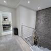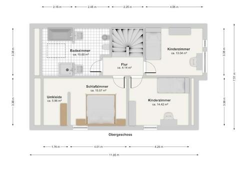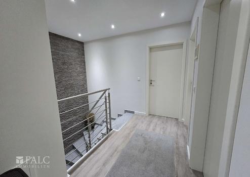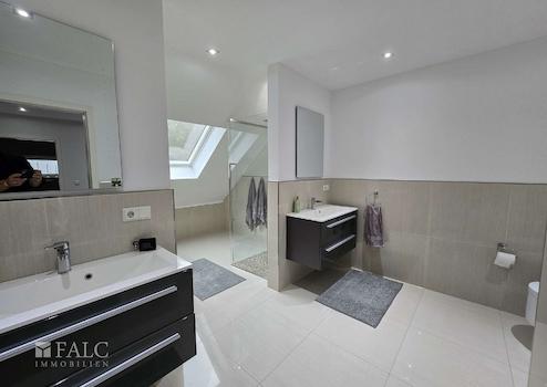 Über eine stilvolle Treppe gelangen Sie in das Obergeschoss, wo sich das Hauptschlafzimmer mit einem geräumigen Kleiderschrank befindet. Zwei weitere Zimmer bieten flexible Nutzungsmöglichkeiten, sei es als Kinderzimmer, Büro oder Gästezimmer. Das große Badezimmer auf dieser Etage ist mit modernen Armaturen und einer komfortablen Dusche und Badewanne ausgestattet. Zudem stehen Ihnen zwei separate Waschtische zur Verfügung.