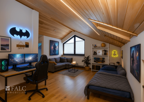 Das Obergeschoss bietet zwei helle Kinderzimmer, ein Schlafzimmer mit angrenzender Ankleide, ein Badezimmer sowie ein separates WC – ideale Voraussetzungen für das Familienleben mit viel Platz für Rückzug und Geborgenheit.