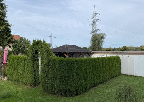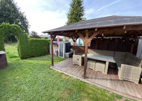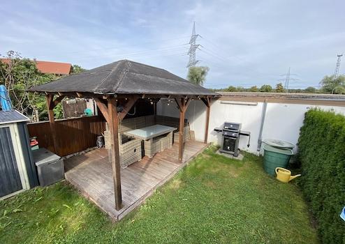 • Wunderschön angelegter Garten (ca. 50 m²) mit Sichtschutzhecke, Holzpavillon und Gartenlaube/Holzlager