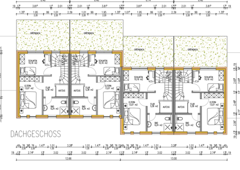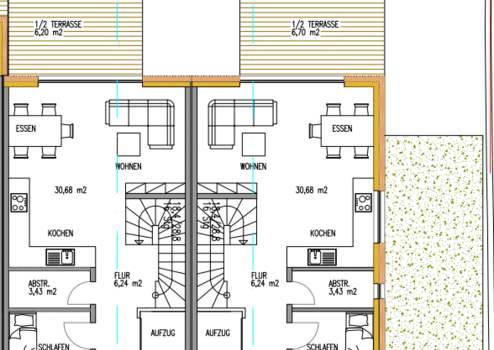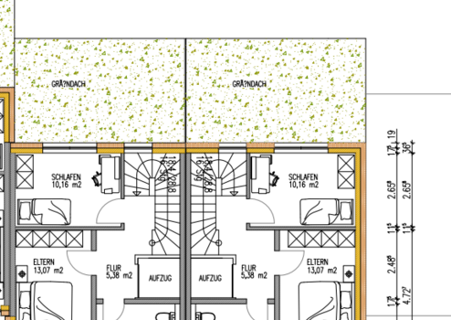 Die Planung für dieses Objekt sieht im Erdgeschoss die Eingangsebene vor. Hier befinden sich die Diele, ein Gästezimmer mit angeschlossenem Bad, die Technik sowie ein Kellerraum. Der eingeplante Aufzug ist optional und kann gegen Mehrkosten erstellt werden. Über eine schöne Treppe gelangen Sie in das Obergeschoß. Hier befiinden sich der helle Wohn/Essbereich mit offener Küche mit Ausgang auf die attraktive Terrasse und in den Garten. Der Küche ist ein Abstellraum zugeordnet. Das Obergeschoss wird durch das Kinderzimmer sowie das Bad mit Fenster vervollständigt. Das Dachgeschoß besteht aus dem Elternschlafzimmer, einem weiteren Bad mit Fenster sowie einem Kinderzimmer. Optional kann auf dem Gründach eine Dachterrasse erstellt werden