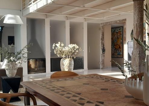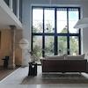 Großzügige, lichtdurchflutete Räume schaffen eine einladende Atmosphäre, während bodentiefe Galeriefenster das Tageslicht optimal einfangen. Durch die großen Fenster kann man die mediterrane Gestaltung des Gartens mit Zypressen und Olivenbäumen bewundern.