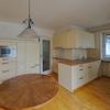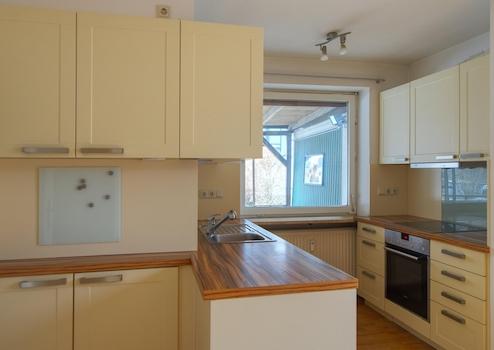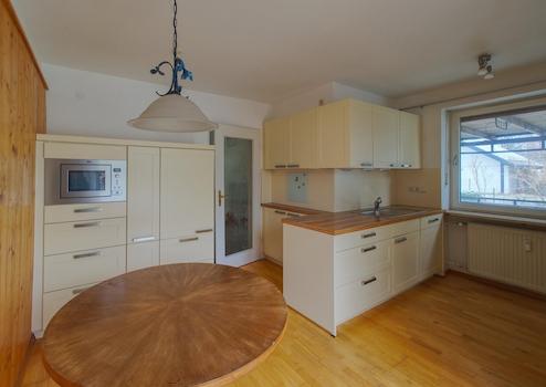 Die Küche ist ebenfalls mit Parkettboden sowie einer funktionalen Einbauküche ausgestattet und bietet einen direkten Zugang zum hinteren Teil des Gartens.