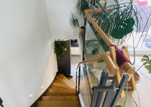 Von der Küche aus gelangen Sie über eine schöne beleuchtete Holztreppe mit Stahlwangen in das Wohnzimmer.