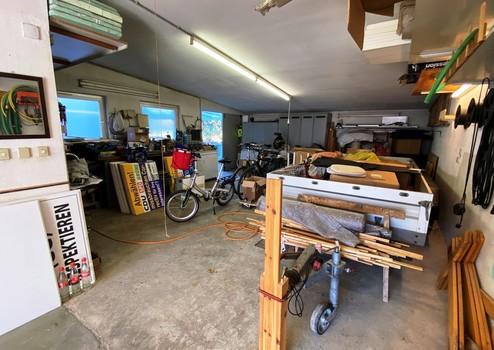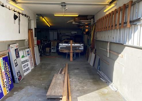 Die Garage ist sehr groß; es wurden schon drei PKWs abgestellt. Im hinteren Bereich gibt es eine Montagegrube mit Steckdose.