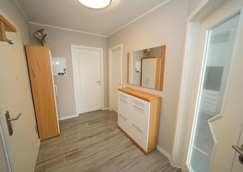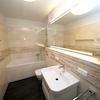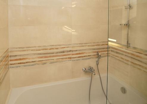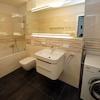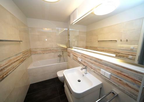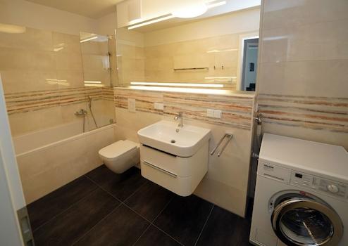 Das modern geflieste Badezimmer besitzt eine Badewanne, in der Sie die Seele nach einem langen Tag baumen lassen können. Die Waschmaschine findet hier zudem auch ihren Platz.
