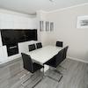 Über eine Flügeltüre mit Glas betreten Sie das einladende Wohnzimmer mit einer offenen Küche und angrenzendem Essbereich.