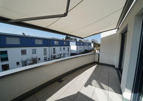 Der sonnige Balkon, der zudem über eine elektrische Markise verfügt, lädt zum Verweilen und Entspannen ein. Aufgrund der wunderbaren Größe des Balkons finden hier ein großer Tisch inkl. Stühle Platz.