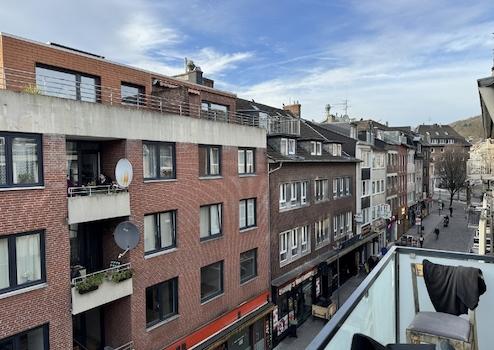 Der Blick öffnet sich vom Balkon aus zu einem kleinen Platz an der gegenüberliegenden Sparkasse, bis zur Uni-Bibliothek, sowie auf die Fußgängerzone auf den beiden anderen Seiten.