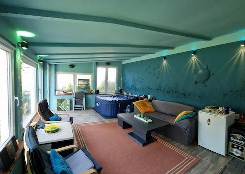Ein weiteres außergewöhnliches Merkmal ist ein Gartenhaus, das mit einem Whirlpool sowie TV- und Internetanschluss ausgestattet ist. Hier kann man sich nach einem langen Arbeitstag entspannen und das ein oder andere Fußballmatch genießen.