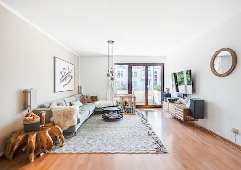 Über den Flur gelangen Sie in den großzügigen Wohnbereich, der dank seiner Westausrichtung viel Tageslicht erhält und Zugang zu einem der beiden Balkone bietet – ideal zum Sonnenbaden und Entspannen. Große Fensterflächen schaffen eine freundliche Atmosphäre und eröffnen einen schönen Blick in den grünen Innenhof der Wohnanlage. Angrenzend befindet sich die Küche, von der aus der zweite Balkon mit Grünblick zugänglich ist – ein perfekter Ort für ruhige Morgenstunden oder entspannte Momente im Freien.