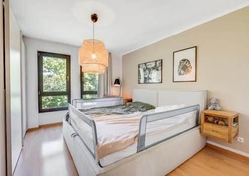 Der private Bereich der Wohnung liegt im hinteren Bereich: ein Vorraum sorgt hier für zusätzlichen Stauraum und eine klare Trennung zwischen Wohn- und Ruhezone. Zwei großzügige Schlafzimmer bieten ausreichend Platz für jeweils ein Doppelbett sowie einen geräumigen Kleiderschrank. Das innenliegende Badezimmer mit Duschwanne ist hell gefliest und befindet sich in einem gepflegt Zustand. Ein separates WC ergänzt die Wohnebene sinnvoll.