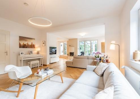 Hier sehen Sie ein außergewöhnliches Penthouse, welches 2001/2002 aufwendig kernsaniert wurde. Auf großzügigen 265 m² lässt es sich hier außergewöhnlich residieren. Bereits wenn sich die Eingangstüre öffnet, wird dies deutlich spürbar: Die lange Sichtachse des herrschaftlich anmutenden Entrées vermittelt eine Weitläufigkeit, die durch die 2,80 m hohen Decken noch unterstützt wird. Rechter- und linkerhand verteilen sich die durchdacht angeordneten Räume, während sich der eindrucksvolle Wohn- und Essbereich als das Herzstück des Penthouses am Ende der Diele eröffnet. Breite Flügeltüren, stilvolles Fischgrätparkett und eine herrliche Luftigkeit zitieren dabei Elemente der "Belle Epoque", sodass man sich hier beinahe in einer klassischen Jugendstil-Altbauwohnung wähnt. Die großen Fensterfronten im Wohnbereich bieten imposante Blicke über die umlaufende Dachterrasse ins Grüne und schaffen eine ausgesprochen helle Lichtsituation. Das eigentliche Highlight ist jedoch die überdachte Süd-West-Terrasse: Diese lässt sich in einen nahezu konturlosen Wintergarten verwandeln, in dem es sich wetterunabhängig entspannen lässt – am besten direkt nach dem Besuch in der eigenen Wellness-Oase. Wenn der hektische Alltag keine Zeit dafür lässt, sorgt eine warme Dusche im edlen Masterbad, das mit dem großen Schlafzimmer sowie dem Ankleidebereich sinnvoll zu einer Mastersuite zusammengefasst ist, für kleine Momente der Ruhe. Die weiteren Räume, die als Kinder-, Gäste oder Arbeitszimmer genutzt werden können, sind ebenfalls mit zusätzlichen en-Suite-Duschbädern ausgestattet, was eine entsprechende Privatsphäre und kurze Wege ermöglicht. Von der Regulierung des Raumklimas angefangen, bis hin zur Steuerung der Jalousien, sowie der Sonnenmarkise auf der Terrasse, es lässt sich praktisch alles über das Smart Home System steuern.