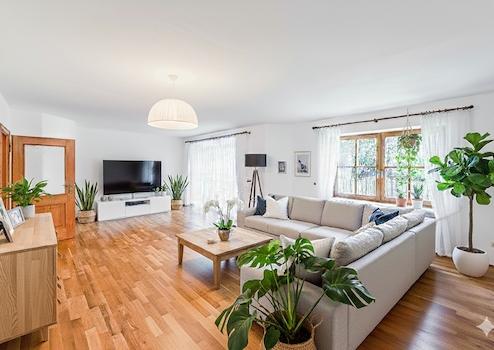 Im Erdgeschoss steht der Mittelpunkt des Familienlebens im Vordergrund: eine großzügige Wohnküche mit angrenzendem Ess- bzw. Aufenthaltsbereich, in dem ein gemütlicher Kachelofen für wohltuende Wärme sorgt. Das separate Wohnzimmer bietet direkten Zugang zur sonnigen Südterrasse – perfekt für entspannte Stunden im Freien. Ein Gästezimmer und ein zweiter Hauseingang erweitern die Nutzungsmöglichkeiten dieses Geschosses zusätzlich.