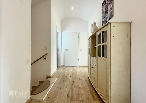 Der Hauptwohnbereich im Erdgeschoss besticht durch einen offenen Wohn- und Essbereich mit integrierter Küche. Eine kleine Abstellkammer bietet zusätzlichen Stauraum, während der direkte Zugang zur großen Terrasse das Wohnen ins Grüne erweitert. Ein geräumiger Windfang und ein Gäste-WC runden das Erdgeschoss ab.
