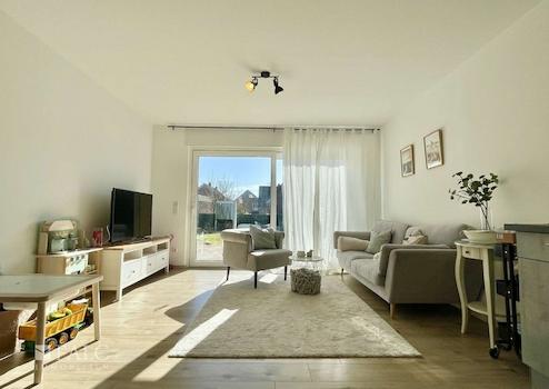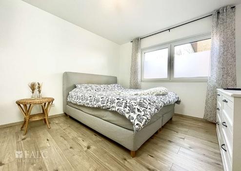 Die separate Einliegerwohnung bietet mit ihren zwei Zimmern eine komfortable Wohnlösung für Mieter oder Familienmitglieder. Der direkte Eingang führt in das Wohnzimmer, von dem aus man auf die eigene Terrasse und in den Garten gelangt. Über einen kleinen Flur erreicht man das Schlafzimmer sowie das Badezimmer.