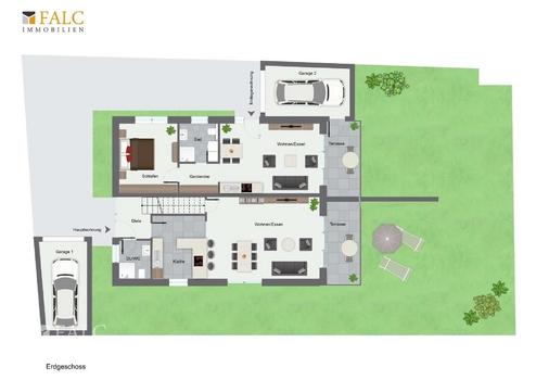 Das Haus überzeugt mit zwei separaten Eingängen, zwei Garagen und zwei voneinander unabhängigen Gärten, sodass beide Wohneinheiten autonom genutzt werden können. Die großzügigen Terrassen laden zum Verweilen ein und erweitern den Wohnraum ins Freie.