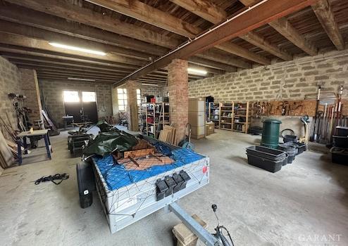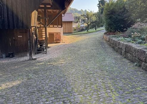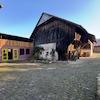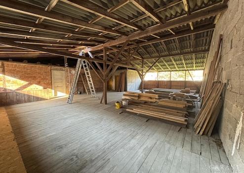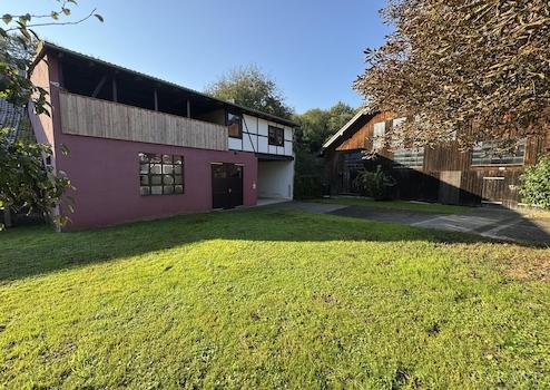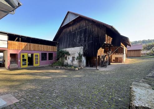 Auf der Rückseite des Bachlaufs befindet sich zudem die große, ehemalige Sägewerk-Halle mit rund 400 Quadratmetern Nutzfläche, die im rustikalen Stil mit viel Holz gestaltet ist. Das Anwesen wird von einem Bach durchzogen, der im Sommer für eine angenehme Abkühlung sorgt, und lädt dazu ein, die Natur in vollen Zügen zu genießen. Darüber hinaus bietet die Schreinerei-Halle Potenzial als Eventlocation, zum Beispiel für Hochzeiten oder andere Feierlichkeiten, und eröffnet damit vielseitige Nutzungsmöglichkeiten für die Zukunft.