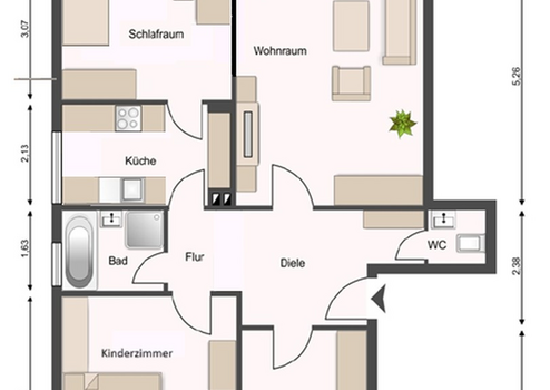 Zudem wurde der Grundriss dahingehend verändert, dass das WC vergrößert wurde und mit dem Einzug einer zusätzlichen Wand der ursprüngliche Grundriss wieder von drei auf vier Zimmer erweitert wurde. Es wurde so vorbereitet, dass ein Rückbau auf drei Zimmer ebenfalls einfach zu realisieren ist.