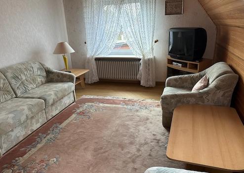 Die Räumlichkeiten im Dachgeschoss beinhalten einen Flur, Duschbad mit WC, Wohnzimmer, Schlafzimmer, Kinderzimmer (unter 10 m² groß) sowie eine Küche mit älterer Küchenzeile.