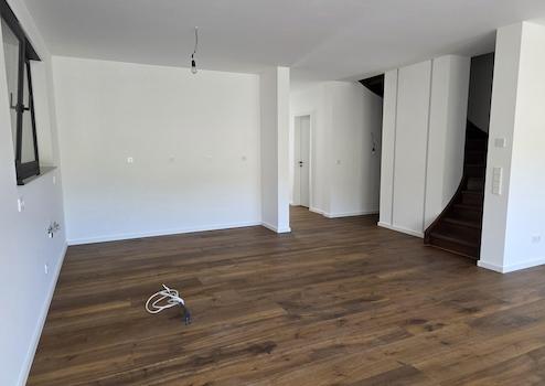 Auf einer Grundstücksfläche von ca. 298 m² bietet die Immobilie rund 180 m² Wohn- und Nutzfläche. Der offen gestaltete Wohn-, Ess- und Kochbereich im Erdgeschoss überzeugt mit einer großzügigen Deckenhöhe und zwei Hebeschiebetüren, die für viel Tageslicht und ein angenehmes Raumgefühl sorgen.