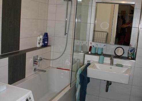 Das Bad hat eine Badewanne mit Glasscheibe dadurch kann sie sehr gut zum Duschen verwendet werden. WC und Waschbecken sind ebenfalls vorhanden. Weiter befindet sich ein Heizkörper als Handtuchtrockner im Bad, sowie ein Anschluss für die Waschmaschine und einen Trockner.