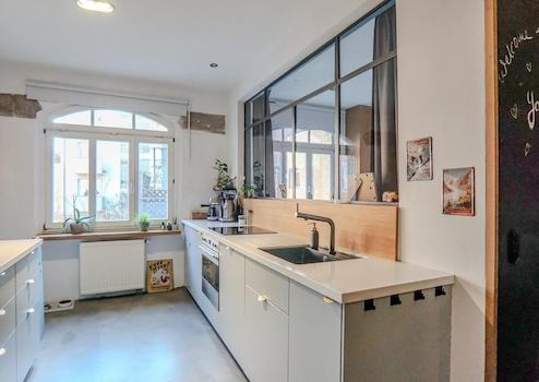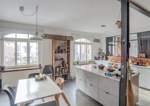 Die moderne Einbauküche mit freistehendem Küchenblock ist im Kaufpreis enthalten.