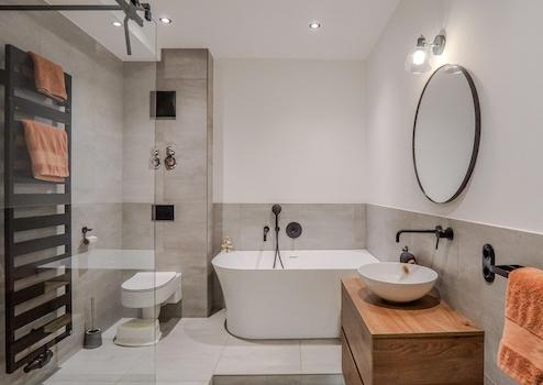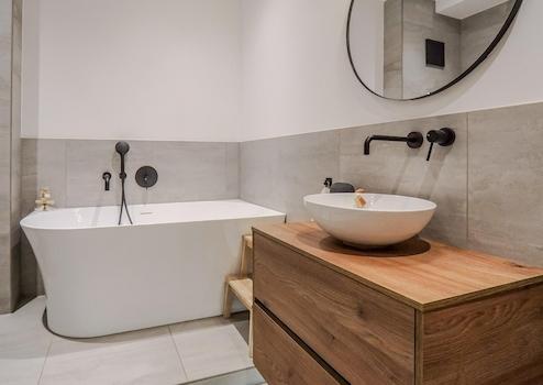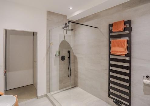 - Badezimmer (2023 renoviert) mit Walk-in-Regendusche, Badewanne und hochwertigen Fliesen