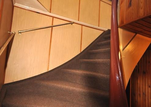Treppe: Holztreppe mit einseitigem Handlauf und Teppich belegt