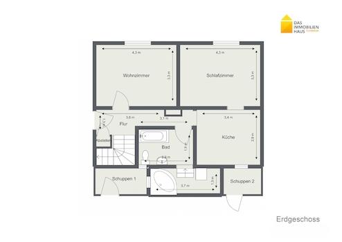 Erdgeschoss: Flur inkl. Treppenhaus, Wohnzimmer, Bad, Küche, Schlafzimmer
