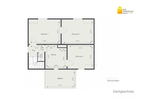 Dachgeschoss: Flur inkl. Treppenhaus, 3 Zimmer, Küche, überdachter Balkon