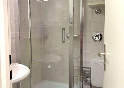 * Badezimmer mit Glasdusche, WC und Fliesenboden