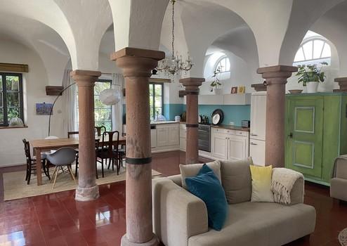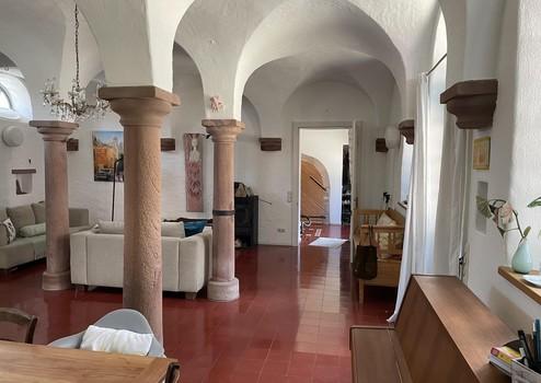 Vom abgeschlossenen Innenhof, der mit 2 weiteren Parteien geteilt wird, betreten Sie das Haus durch die großzügige Diele und blicken direkt in das 60 qm große, wunderschöne Kreuzgewölbe, das Herzstück des Hauses.