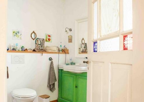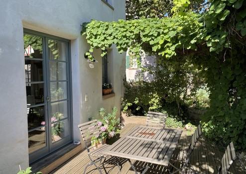 Diese wird zurzeit als Wohnküche genutzt und hat Zugang zum Hof und zur Terrasse mit Blick in den kleinen dahinter liegenden Garten.