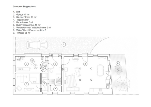 Im Erdgeschoss befindet sich noch eine Gästetoilette mit Dusche, ein Abstellraum und ein weiterer Raum mit Sauna. Von der Diele aus hat man Zugang zum Gewölbekeller.
