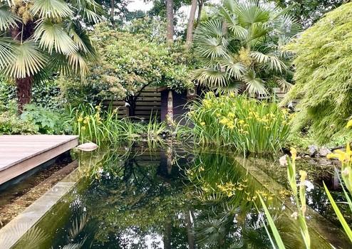 •Großzügige, überdachte Terrasse mit Blick auf einen wunderschönen Schwimmteich im Garten