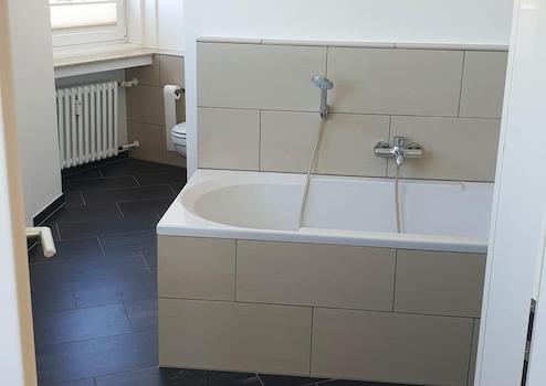 Die Böden sind im Küchen und Sanitärbereich mit freundlichen großformatigen Fliesen belegt. Die übrigen Räume haben ein renoviertes massives Eichen Stäbchenparkett.
