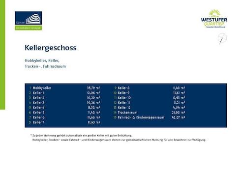 Zu jeder Wohnung gehört zusätzlich ein Abstellraum im Keller. Dort gibt es zur gemeinschaftlichen Nutzung einen Hobbykeller sowie einen Trockenraum für Wäsche und einen Fahrradraum, der bequem von außen zu erreichen ist.