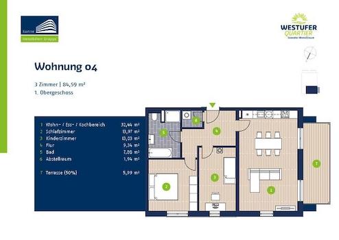 Eine große 3 Zimmer-Wohnung im ersten Obergeschoss, mit zwei Schlafzimmern und einem ca. 32m² großen Wohn- und Essbereich mit offener Küche sowie einer Terrasse, die vom Wohn- und Essbereich aus betreten werden kann. Ergänzt wird dieses Angebot durch ein Masterbad mit Badewanne und Dusche.