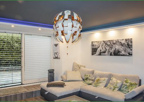 Das Untergeschoss überrascht mit einem wohnlich gestalteten Raum mit einer großen Glasfront, einem großzügigen Badezimmer mit Dusche und schicker Badewanne sowie einer stilvollen Bar mit Illumination und Endlosfenster.