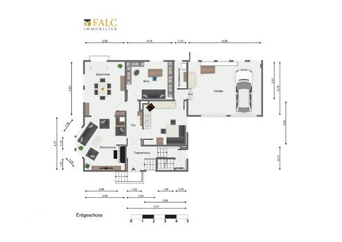Im Erdgeschoss erwartet Sie ein großzügiges, offenes Wohn- und Esszimmer, eine Küche mit Essbereich und angrenzender Vorratskammer, ein Büro sowie ein Flur mit Garderobe. Das geräumige Wohn- und Esszimmer bietet viel Platz zum Entspannen und Wohlfühlen. Vom Esszimmer führt ein direkter Zugang auf die Terrasse und in den Garten – der ideale Ort, um den Feierabend zu genießen.