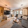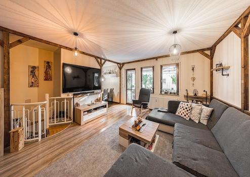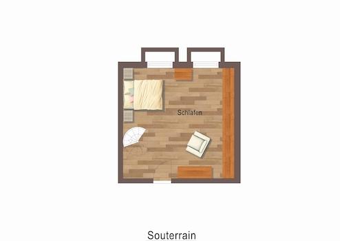 Die angrenzende Küche, zwei weitere Räume sowie ein modernes Bad ergänzen diese Etage. Im unteren Bereich sorgt ein großes Zimmer für Hobby oder als großzügiger Schlafraum für Komfort und Privatsphäre.