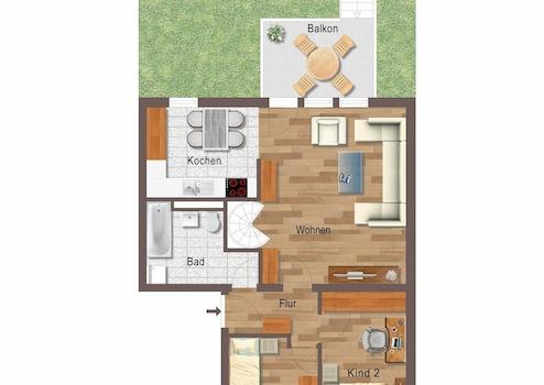 Im oberen Bereich befinden sich der helle Wohn- und Essbereich mit Zugang zum sonnigen Balkon, von dem aus der liebevoll begrünte Garten direkt begehbar ist.