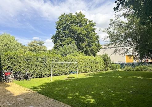 Der große Innenhof ist eine grüne Oase mitten in der Stadt und kann von der Hausgemeinschaft genutzt werden. Perfekt, um im Sommer zu entspannen oder für Kinder Platz zum Spielen zu bieten. Zusätzlich steht Ihnen eine praktische Abstellkammer auf halber Treppe zur Verfügung.