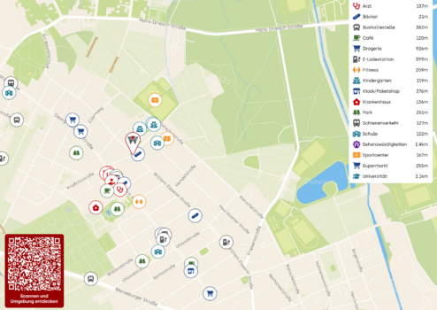Einkaufsmöglichkeiten für den täglichen Bedarf, gemütliche Cafés, kleine Boutiquen und internationale Küche finden sich direkt vor der Haustür. Der nahegelegene Lindenauer Markt ist ein zentraler Treffpunkt, und dank der guten Straßenbahn- und Busanbindung gelangt man in wenigen Minuten in die Leipziger Innenstadt. Auch Radfahrer kommen hier auf ihre Kosten. Gut ausgebaute Radwege führen direkt ins Zentrum oder ins Grüne.